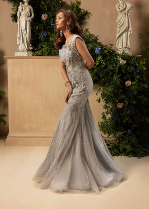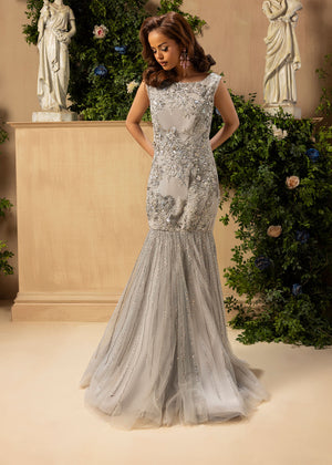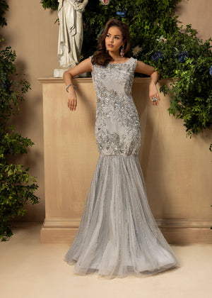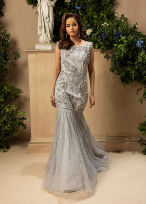 This gorgeous ice-blue net bridal gown features intricate adda work in multi-head patterns. This western marmaide type dress is intended for a respectable, hefty formal look as well as an elegant bridal look. The ensemble is rich with gorgeous and heavily embroidered occean coral-based motifs.