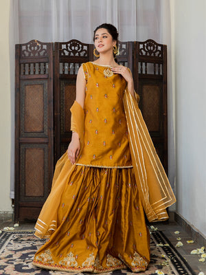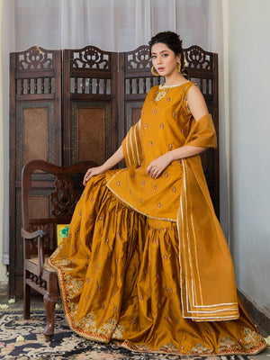 Introducing Aabhi, our three-piece luxury pret ensemble! Marvel in its traditional silhouette, adorned with a vivid color palette and delicate detailing, crafted to leave you breathtakingly sorted for any grand affair.
