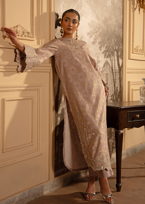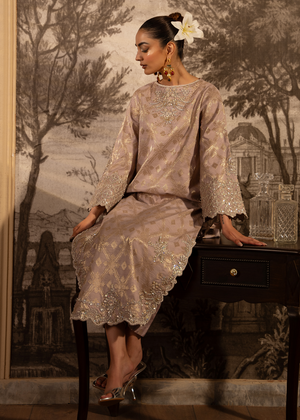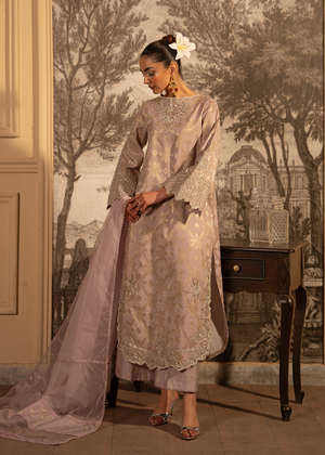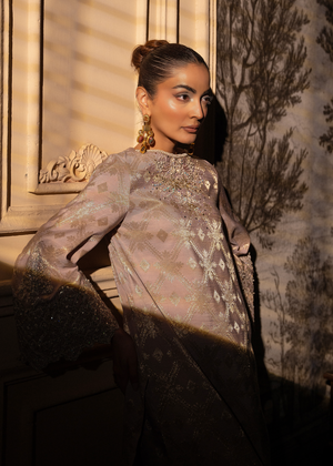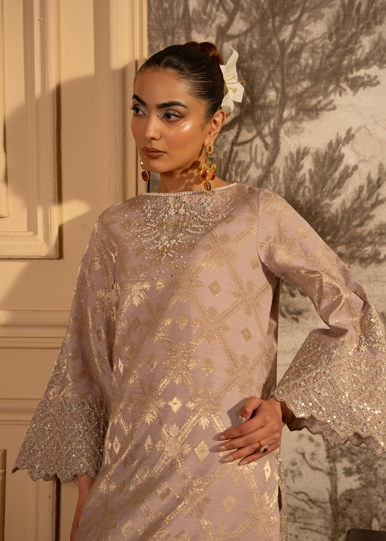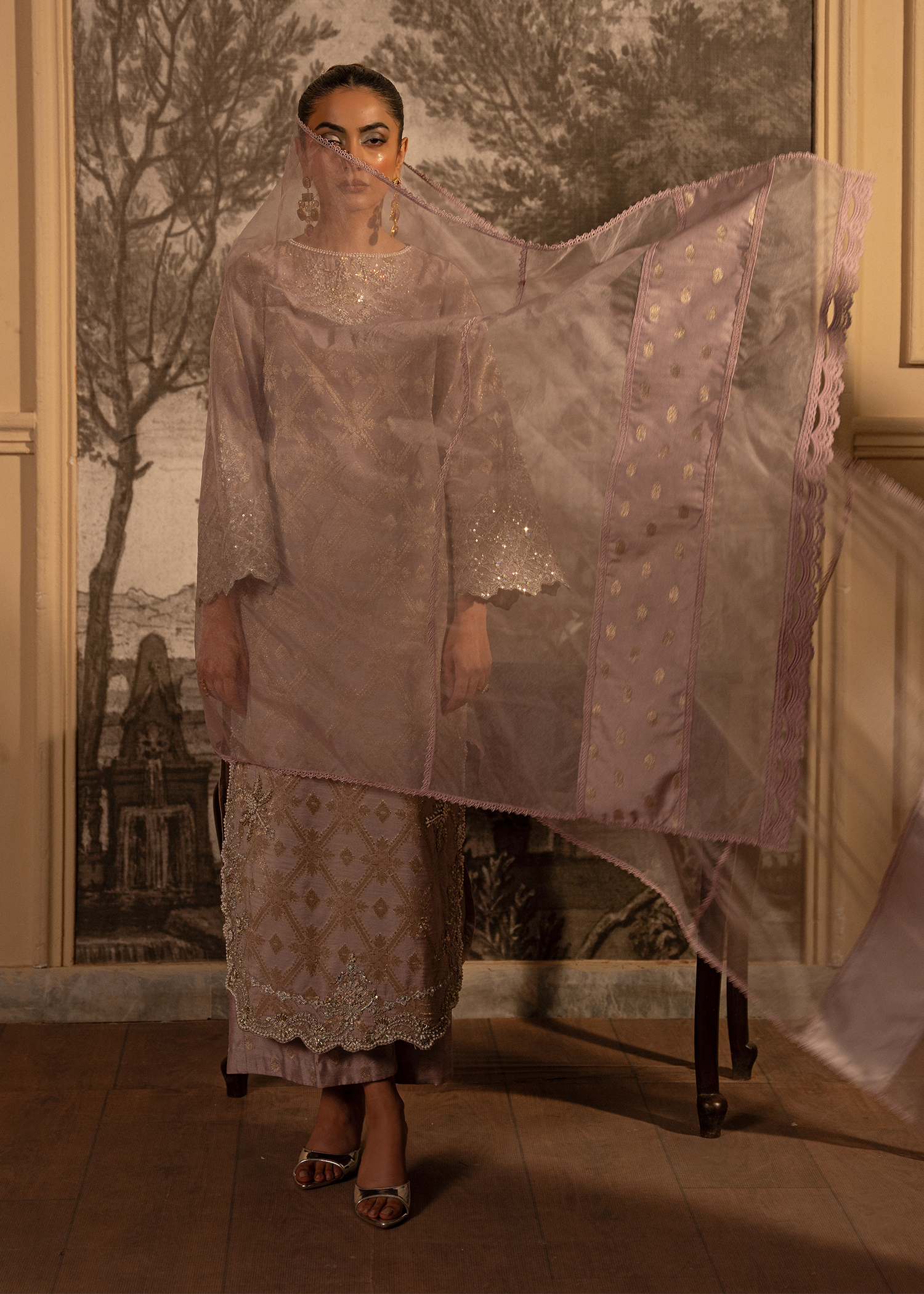 An exquisite mauve dress made of bnarsi cotton silk with lovely self-patterns in a very modern shirt style. The garment was finished with a loose plazo, beautiful neck and borders, and intricate embroidery and beads. The outfit is finished with a lace-adorned organza dupatta.