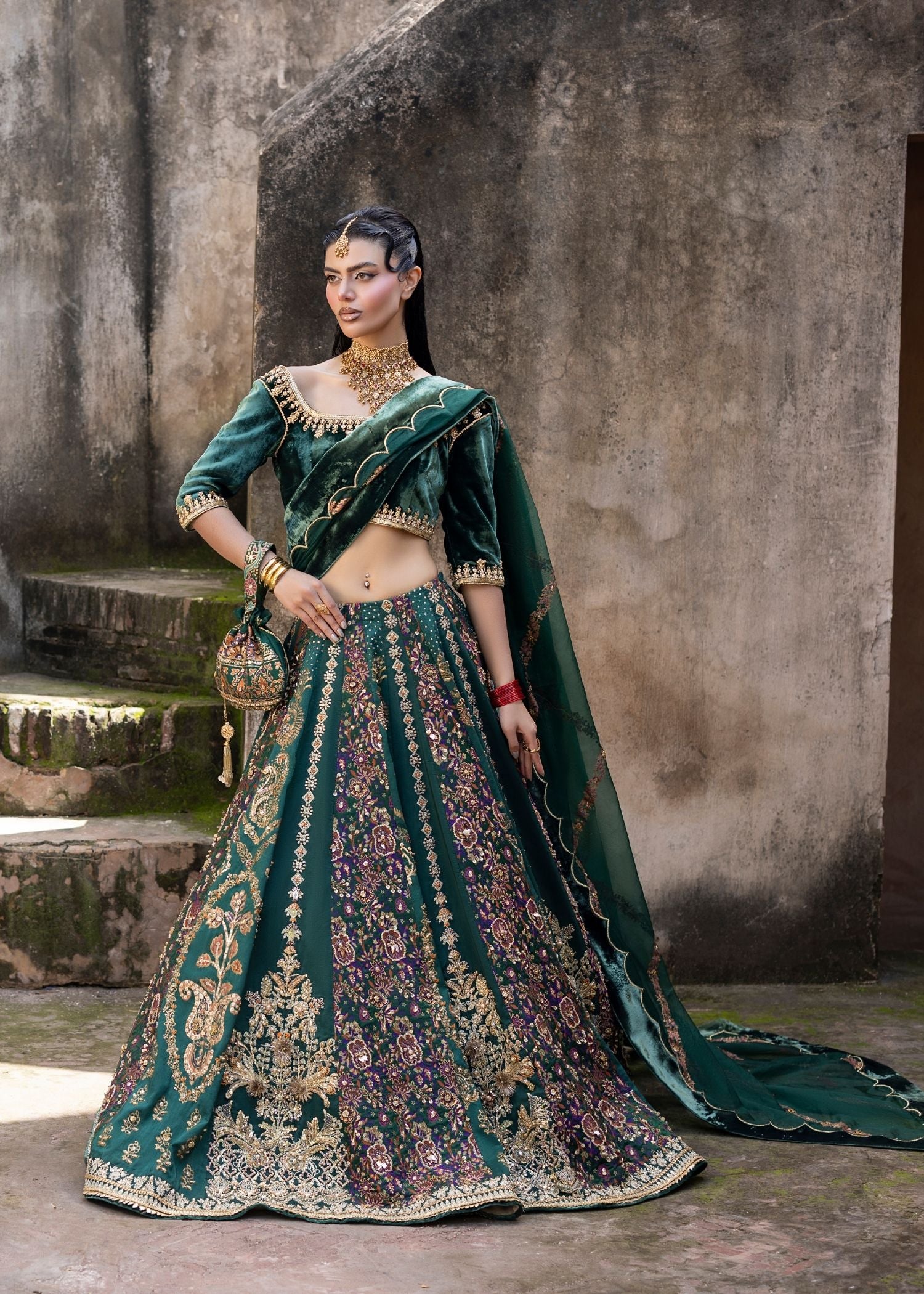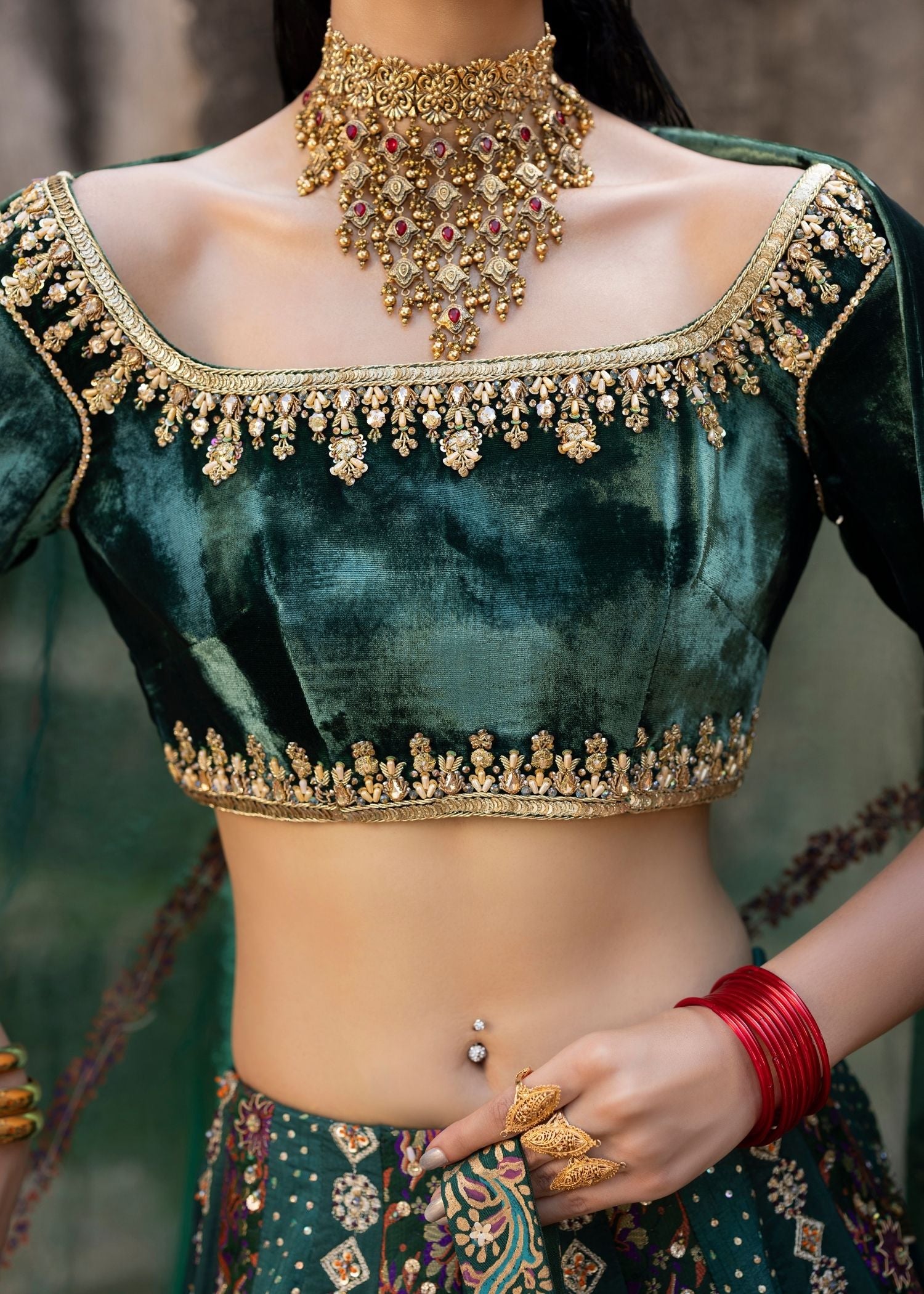 This dark green Thai silk lehnga has a velvet blouse with regal finishing work and a block-printed dupatta with velvet borders. It has numerous panels of embroidery blockprint and khadi work designs with heavy embellishments. A festive couture costume that is both bold and elegant for contemporary traditional attire.