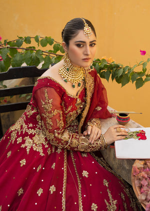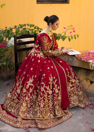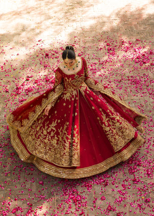 Elevate your bridal glow with our maroon Anarkali lehenga, a traditional masterpiece sparking with grandeur. Steeped in Mughal magnificence, its ornate arches dazzle, while the regal dupatta crowns your splendor with embroidered opulence. An awe-inspiring bridal vision!
