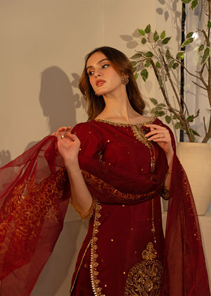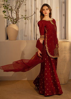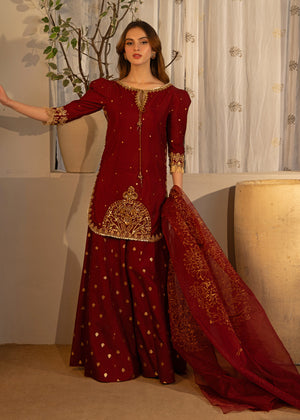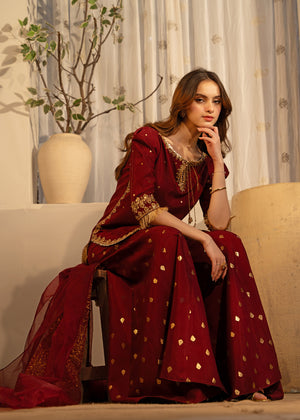 Classic outfit in Deep Burgandi colour based on Thai Silk a short shirt with beautiful side and hem border line and a fantastic hem motif pattern adorned with embelishment and a stunning neckline paired with a beautiful foil print work sharara and a block printed organza dupatta.