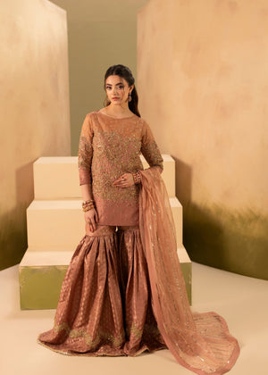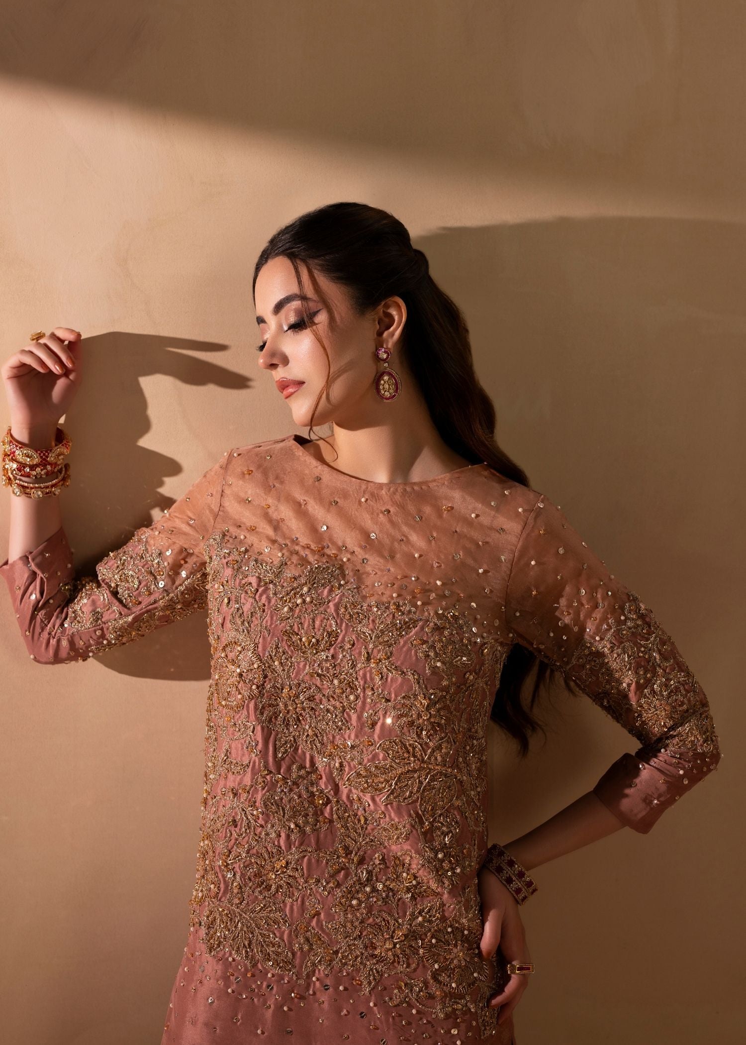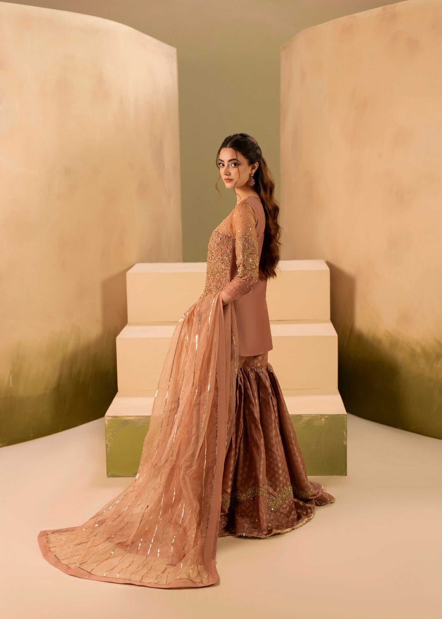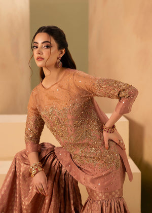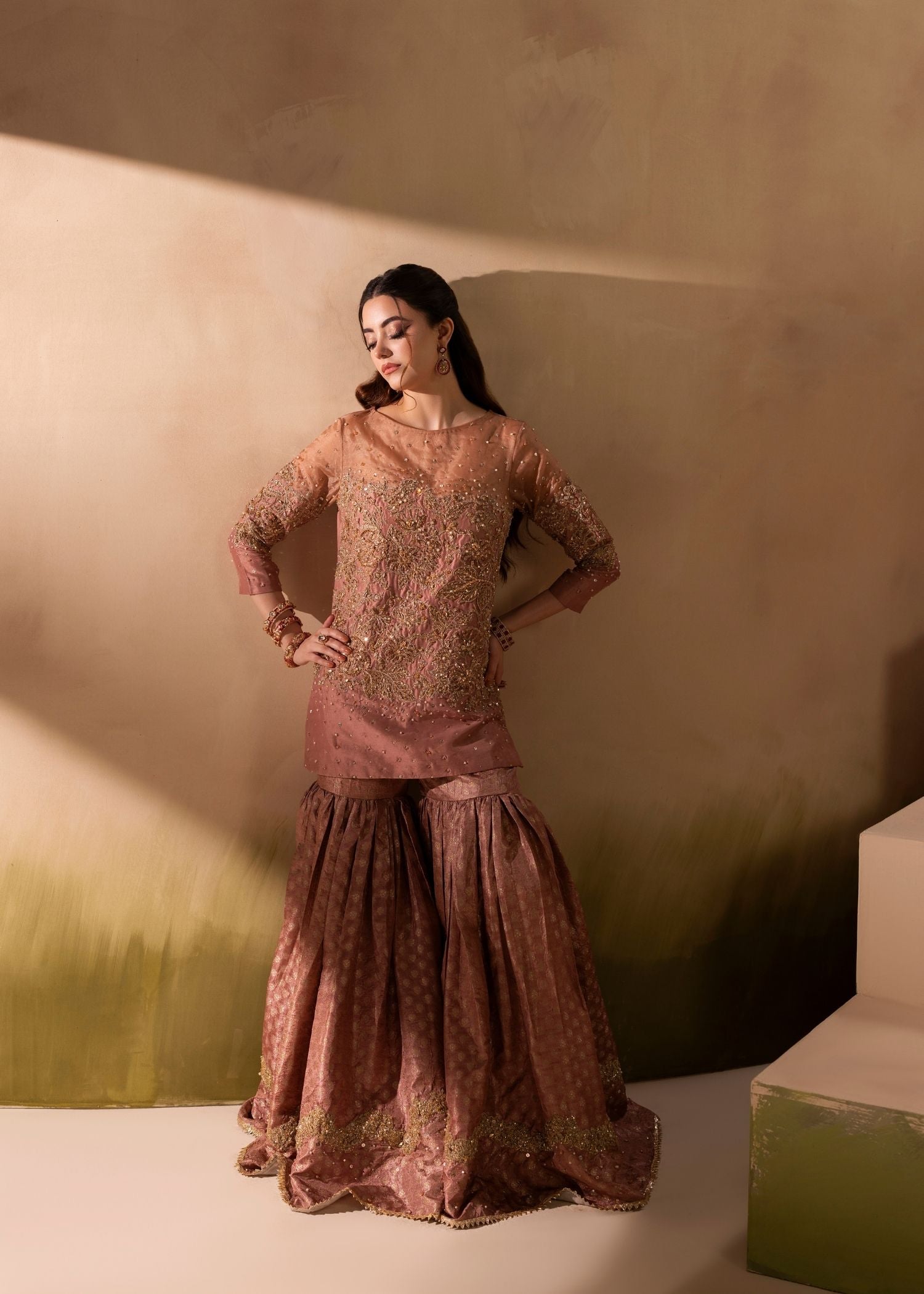 An extremely opulent option for the perfect modern wedding is a straight short shirt, based on marge of organza with pure silk, decorated with embroidery and handcrafted by stunning modern pattern work, teamed with a jamawar gharara with a border finishing.