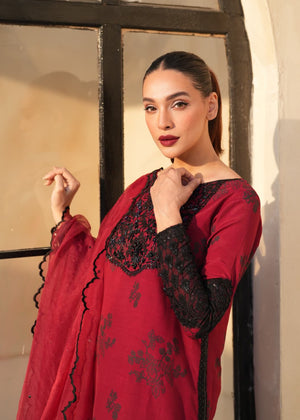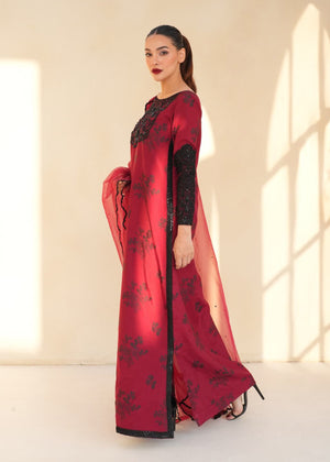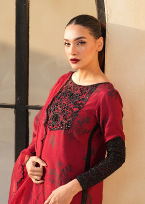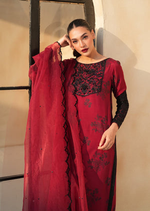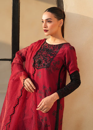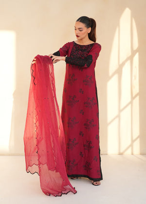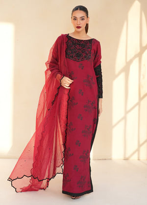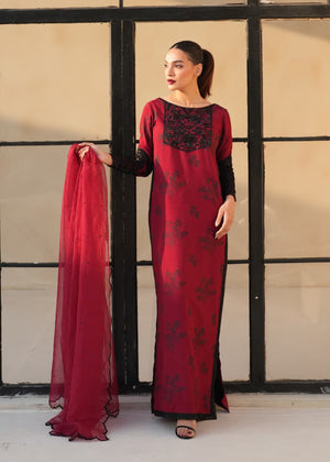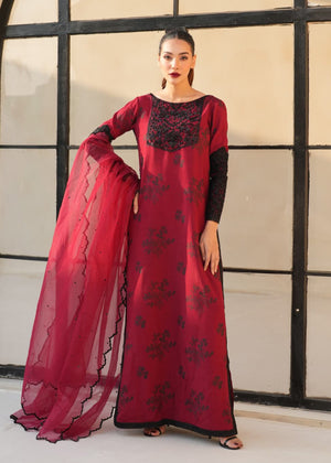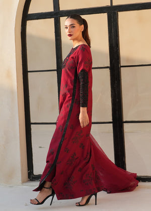 Wearing it with pants and finishing it with a scallop dupatta, this gorgeous long shirt in a beatroot hue is made of Thai Silk and features a heavily adorned neckline, beautiful embroidered sleeves, a border pati around the sides and hem of the shirt and complex screen printing of motifs all over.