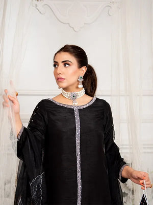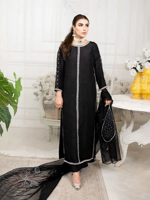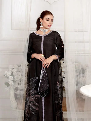 Embrace elegance with Black Swan, a stunning three-piece ensemble. Marvel at the organza dupatta, hand-embroidered and paired with signature embellishments that dance in a trendy color symphony. A breathtaking creation.