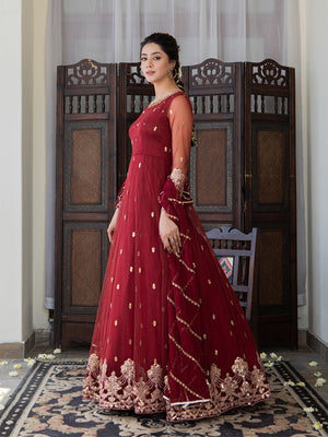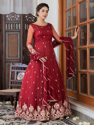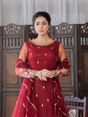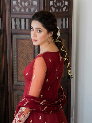 Introducing Our Bulbul Ensemble: a three-piece luxury pret article where vivid red hues meet delicate detailing. This exquisite creation promises to garner admiring glances and set hearts aflutter.