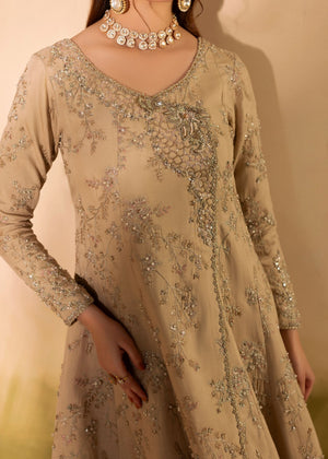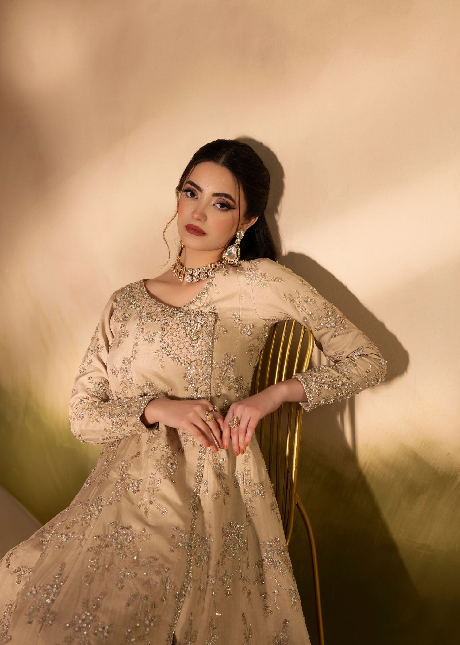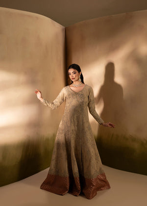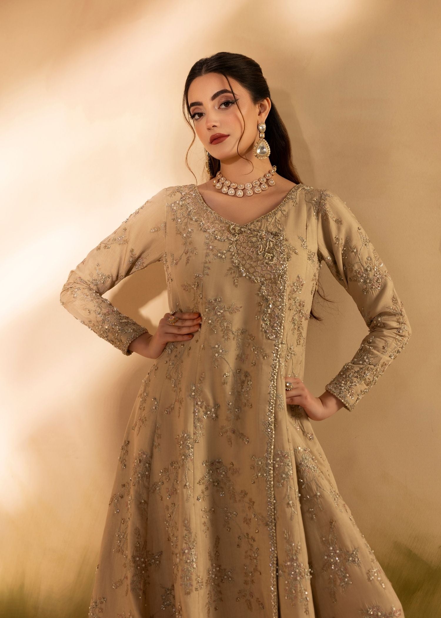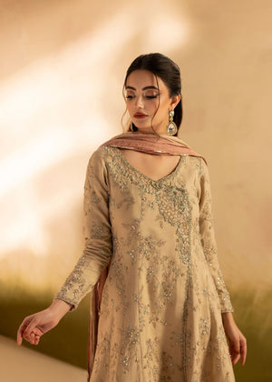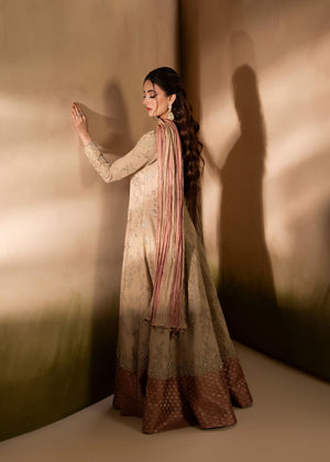 A gorgeous angrakha pishwas with floral patterns decorated with various embellishments, including a jamawar border and elaborate neck work, is combined with a crushed dupatta in dyeing patterns.