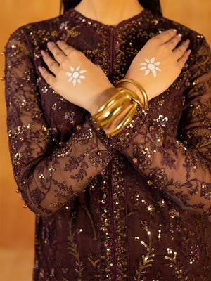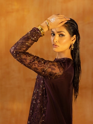 Discover elegance in plum with our exquisite short gown paired with bell-bottom trousers. Crafted from luxurious organza fabric, the gown features intricate heavy embroidery and stunning embellishments. Paired with embroidered bell bottom trousers made from Korean raw silk, this ensemble exudes sophistication and style.
