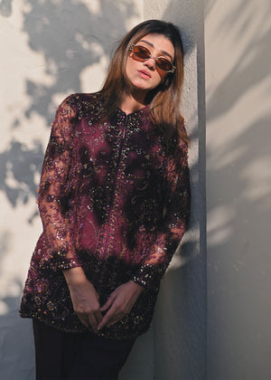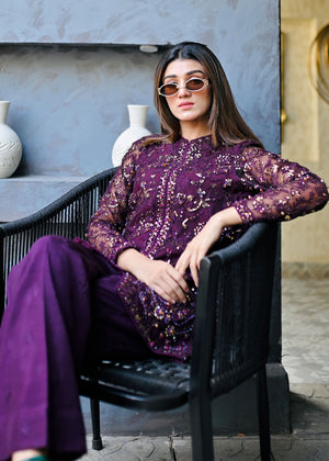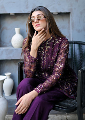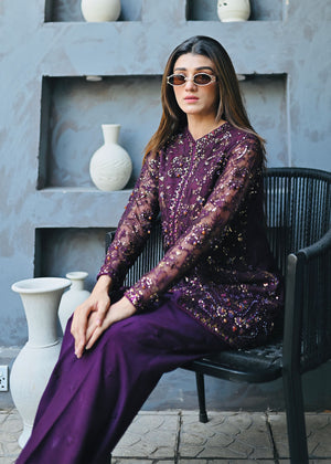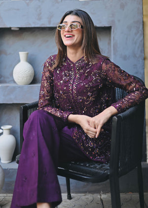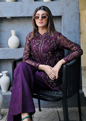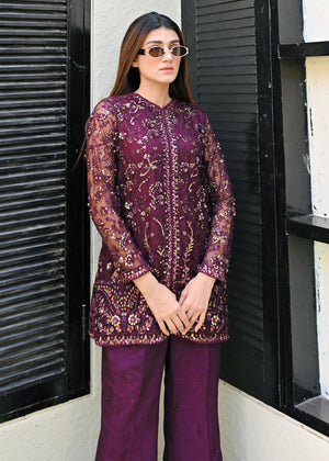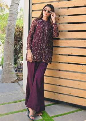 Discover elegance in plum with our exquisite short gown paired with bell-bottom trousers. Crafted from luxurious organza fabric, the gown features intricate heavy embroidery and stunning embellishments. Paired with embroidered bell bottom trousers made from Korean raw silk, this ensemble exudes sophistication and style.