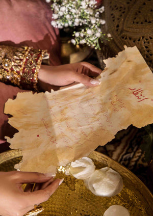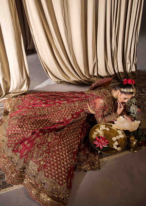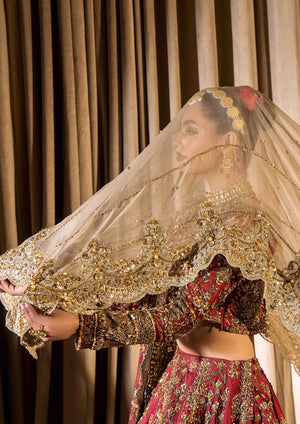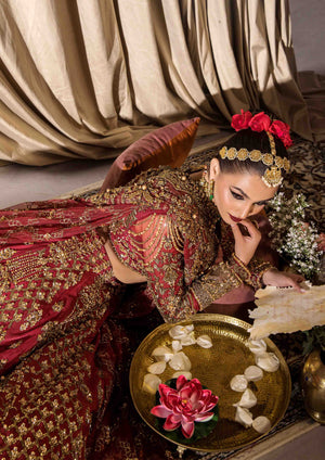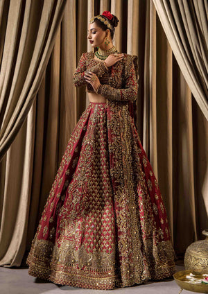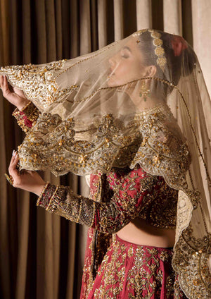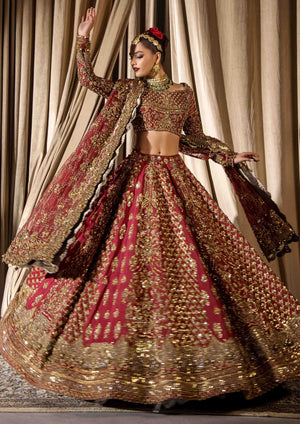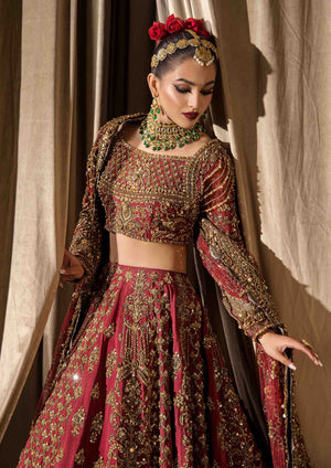 A breathtaking bridal ensemble in a vibrant mehrun hue, crafted from pure raw silk with intricate adda work in multi-head patterns. The ensemble features a lehenga with multiple panels of patterning, a blouse with a wide neckline adorned with heavy embellishments and kora dabka work, and a bridal dupatta with four sided heavy adorned baorders.