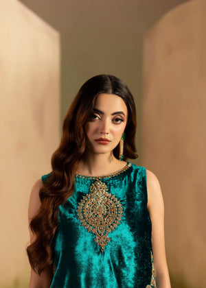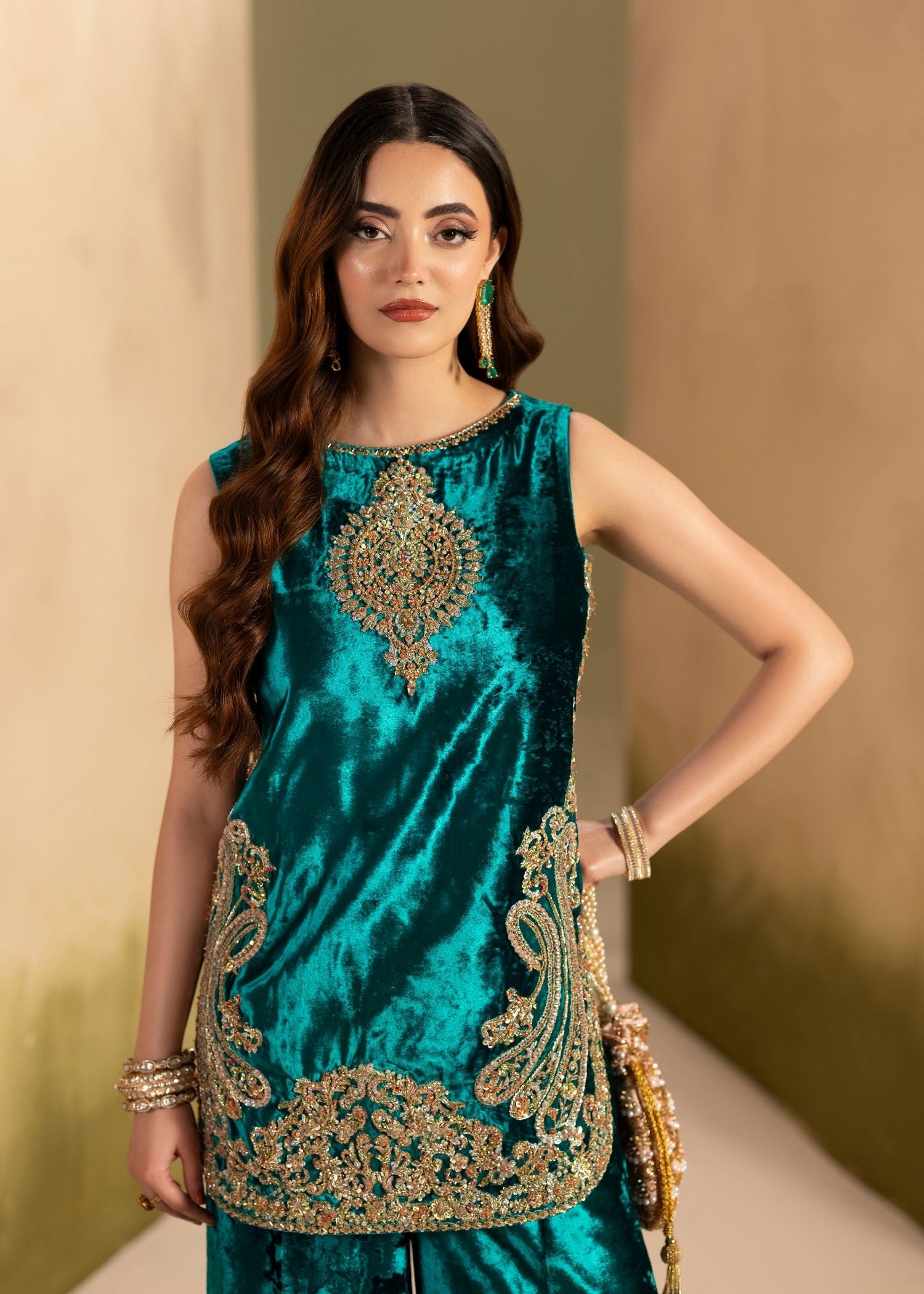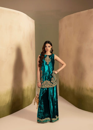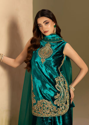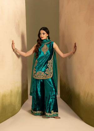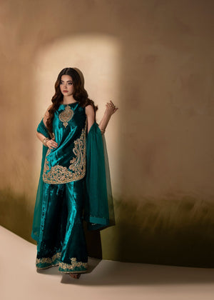 Velvet Sharara and an organza dupatta complete this rich Zink Velvet outfit, which includes a Short shirt with a delicate pattern and exquisite hand-embellished antique and light gold work. A festive formal attire that exudes haute elegance and is both spectacular and sophisticated.