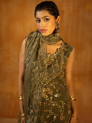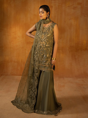 Explore our elegant olive green ensemble featuring a short shirt crafted from organza adorned with intricate embroidery and embellishments. Paired perfectly with Thai silk sharara bottoms boasting embroidered borders, and complemented by a luxurious organza dupatta embellished with heavy embroidery along the edges. Elevate your wardrobe with this exquisite ensemble.