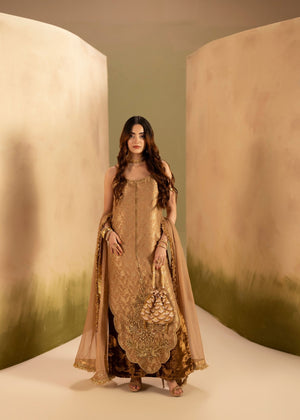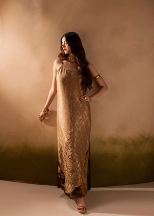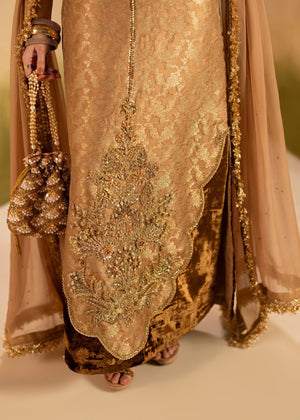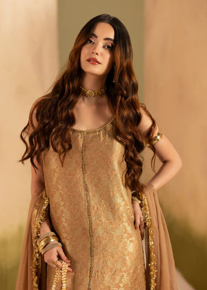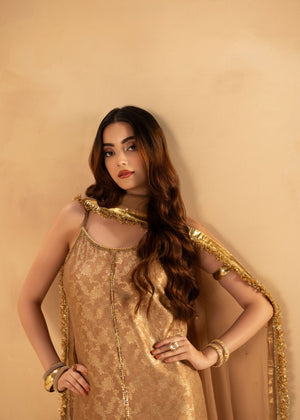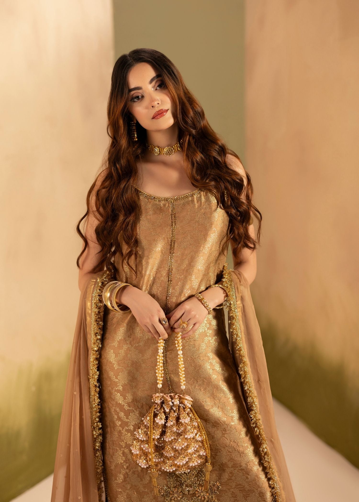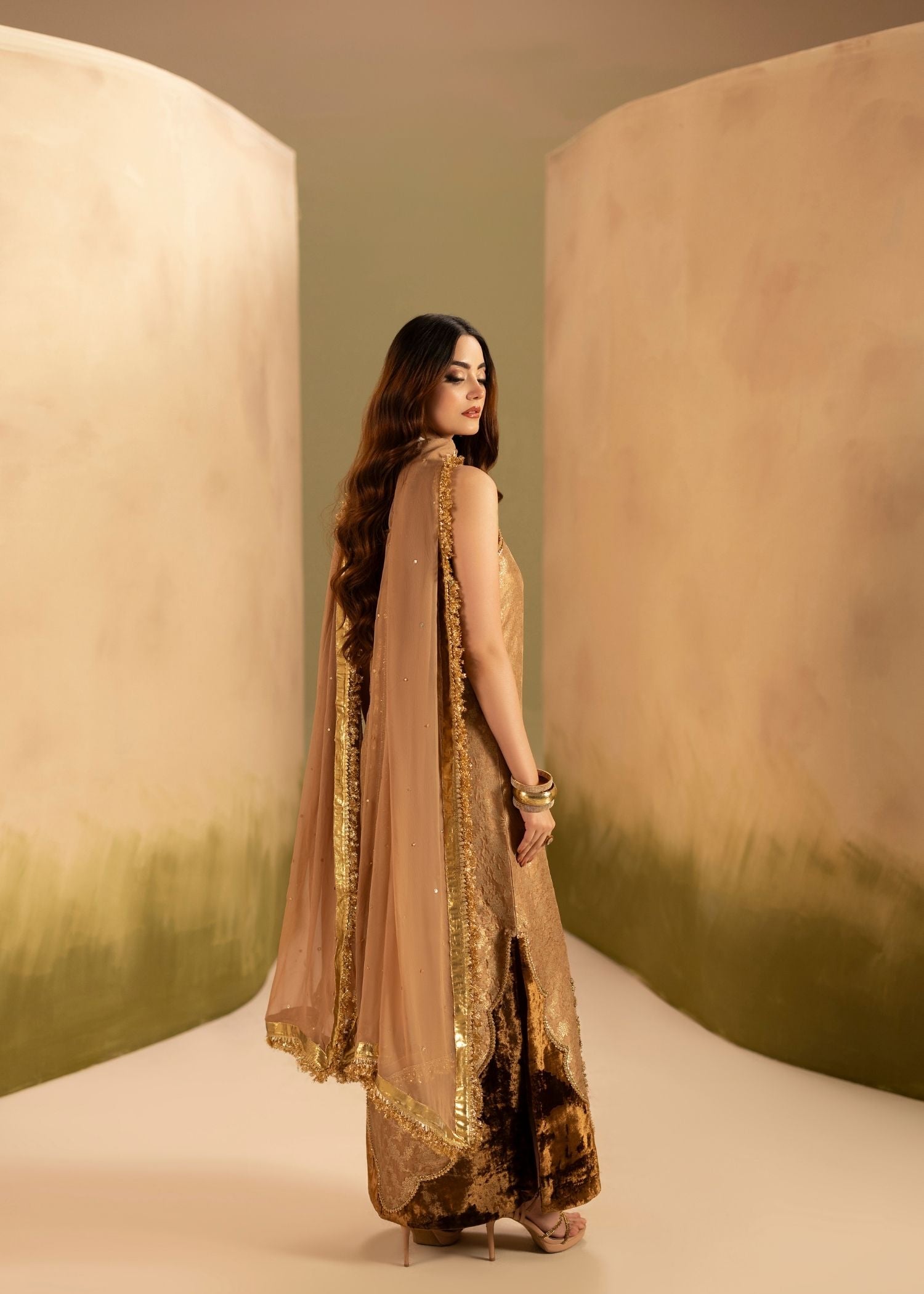 A long A-line shirt with noodles sleeves in soil skin shade, based on zari fabric, embellished with embroidery and handcrafted by gorgeous modern pattern work, paired with a chifon dupatta with Indian kiran finishing, is an incredibly luxurious choice for the ideal modern wedding.