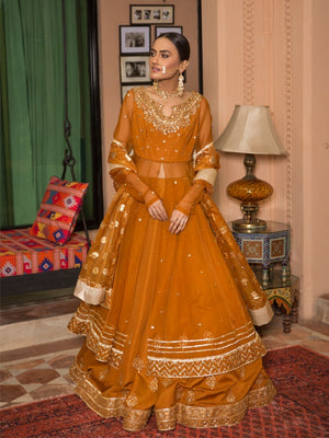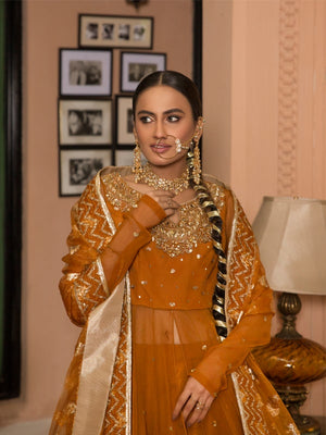 Behold the captivating Hoshmand ensemble! This net pishwas dazzles with exquisite orange and brown embroidery, while golden accents and pipework add regal splendor. A luxurious crushed silk sharara, festooned with robust borders, and a net dupatta, opulently beaded on all sides, elevate this outfit to the height of elegance.