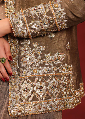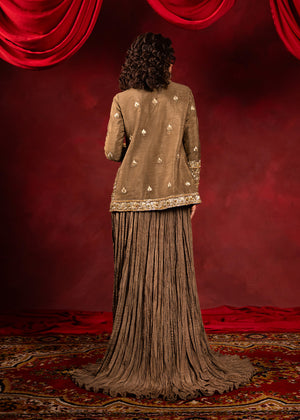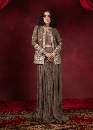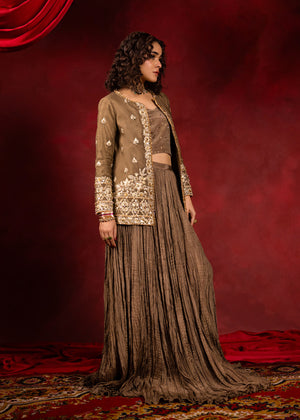 A beautiful estowestern cut in brown colour wore with a booster adorned with thickly random spray of beads,stones, sequence on it in the bottom heaving a crushed skirt this assemble paired with a beautiful korean rawsilk jacket which is adorne with beautiful embroidery patterns and embellished with ada work.
