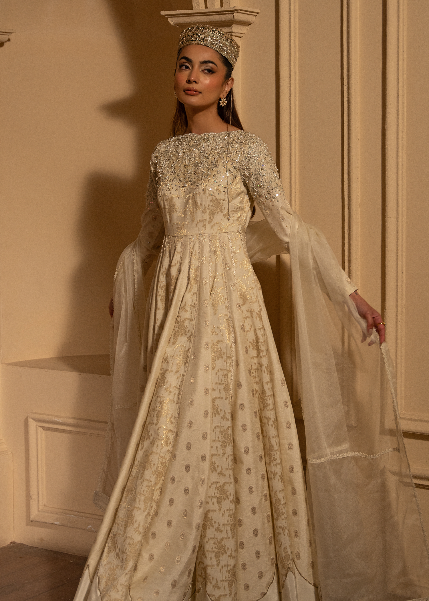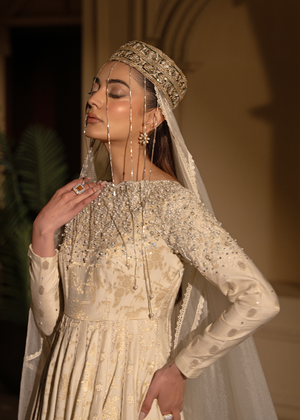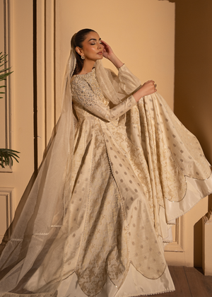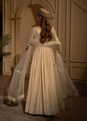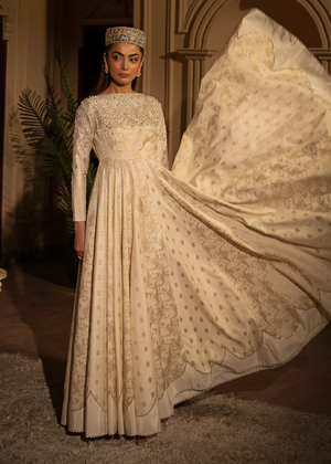 A gorgeous pearl white Anarkali dress with lovely self-patterns made of bnarsi cotton silk. The body work was elaborate beaded and embroidered design and finished with a laced organza dupatta.