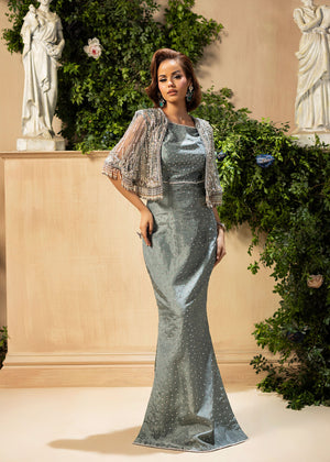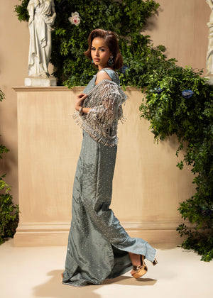 In a dark grey colour It's a gorgeous bodygown with spray of stones all over, shining like stars in milkyway galaxy. It's closed by a stunning and sufestucated beads line, giving a locking border,paired with a beautiful jacket which is embellished with heavily loaded cutdana work and hangings
