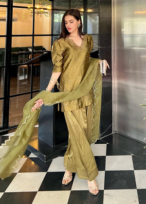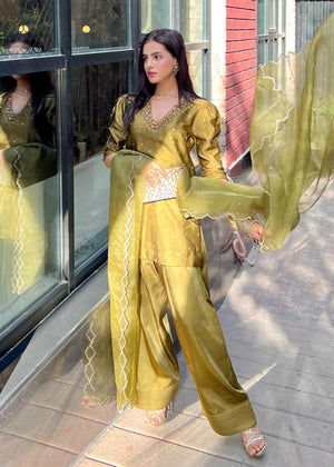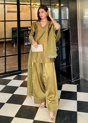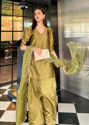 Beautiful suit based on pure silk fabric shirt elegantly designed with randomly spray of sequence and stones on the shirt and the neckline of the shurt is beautifully decorated with crystal and stone elements. This dress is paired with a Punjabi shalwar with wide and embroidered ankle parts and organza dupatta with scallop borders.