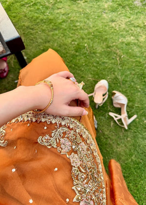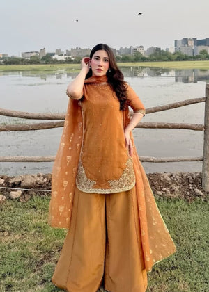 With a block print orgenza dupatta and a sharara in the mediaeval style, which is adorned with gota and lace work, the lovely short shirt is made of orgenza fabric and embellished with embroidery and adda work.
