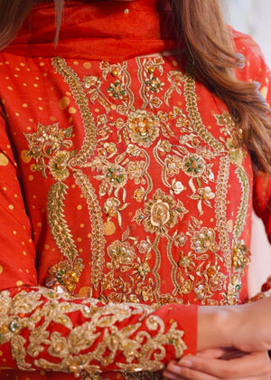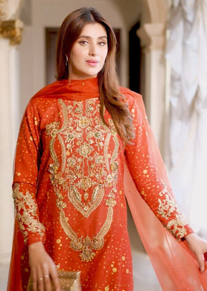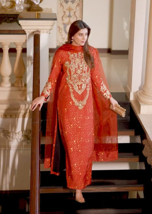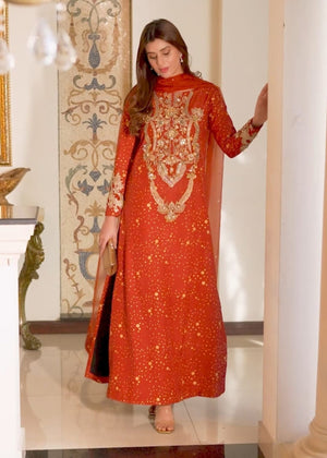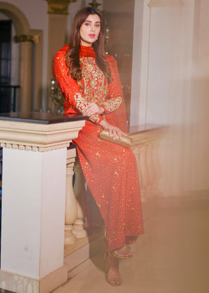Made of Thai Silk, this stunning pre-owned long shirt in rust orange has intricate screen printing throughout, as well as a charming embroidered neck with ornaments. It is paired with slacks and completed with a sprayed dupatta with a screen-printed pallu border.