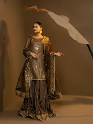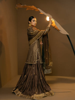 Behold the Mehr un Nisa, a portrait of grandeur in a deep, enchanting brown. Its luxurious shirt and sharara whisper tales of opulence with decadent embellished cuffs and a regal neckline. The breathtaking organza dupatta, adorned with a symphony of sequins and nakshi, crowns this masterpiece, making it a timeless silhouette of splendor.