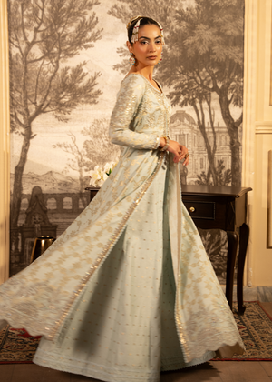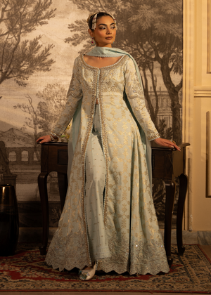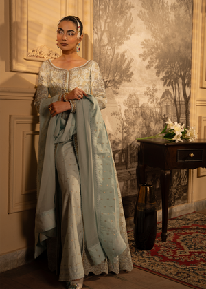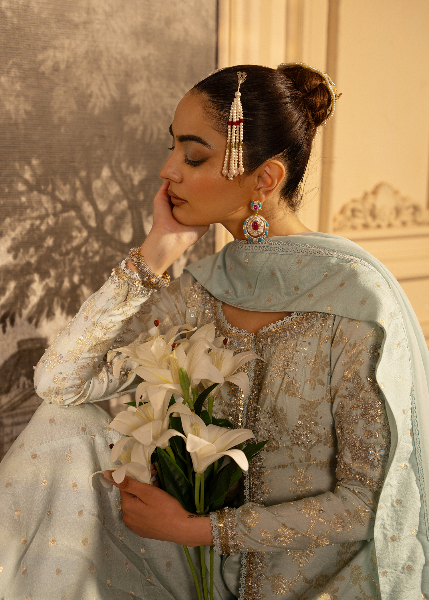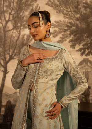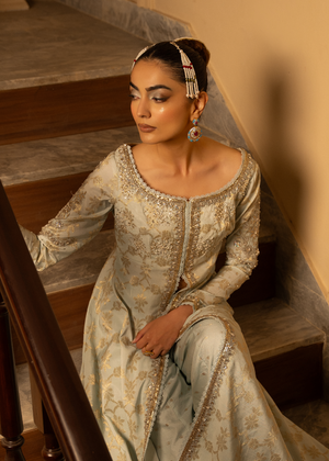 An exquisite aqua sky dress made of bnarsi cotton silk with lovely self-patterns in an open pishwas style. Intricate beadwork and embroidery, lovely borders, and a loose plazo completed the piece. An shifoon dupatta with lace completes the ensemble.