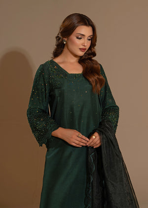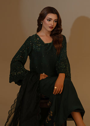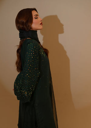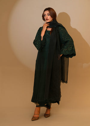 An amazing dark green A-line shirt with gorgeous embroidery on the collar and sleeves, teamed with an orgenza dupatta and screen-printed plazo.