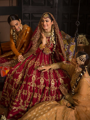 Introducing Mumtaz, our masterpiece bridal lehenga in a sumptuous burgundy-maroon, designed to mesmerize. It boasts lavish embroidery from hem to neckline, with a bodice and sleeves adorned in exquisite linear motifs. The sheer dupatta complements with ornate borders and playful tassels, ensuring every eye is enchanted.