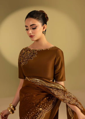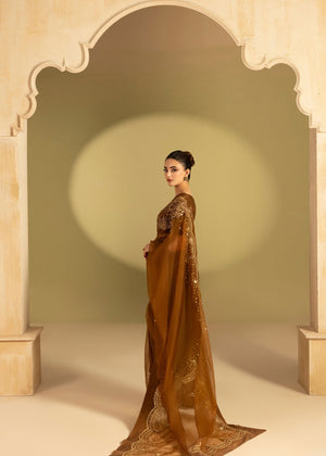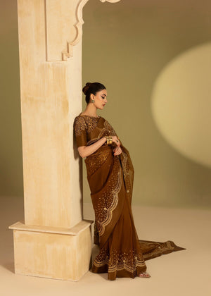 This beautiful saree based on organza fabric with Scalps sequence borders all around and a pure silk blouse with cutwork design elaborate with beautiful work patterns.