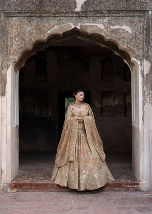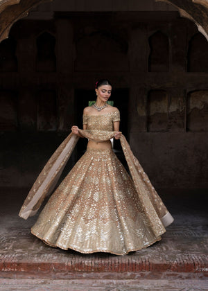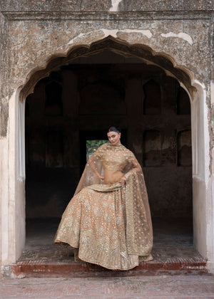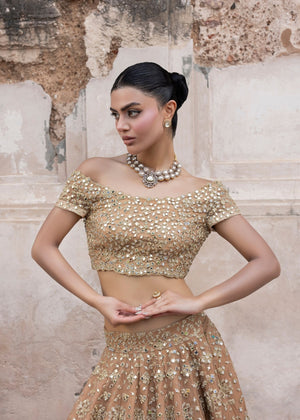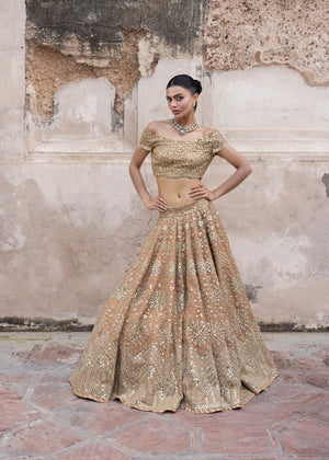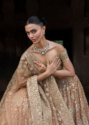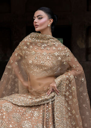 An immaculate organza-based peach lehnga choli with intricate embroidery and a variety of mirror work embellishments. This exquisite and classic festive heavy formal dress is a statement of understated glitz and fine craftsmanship.