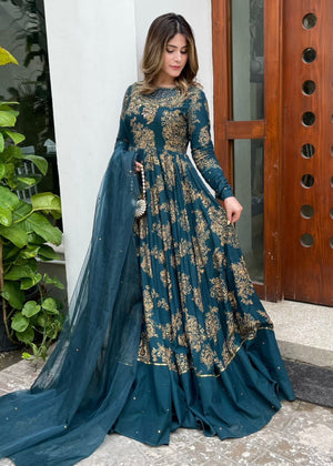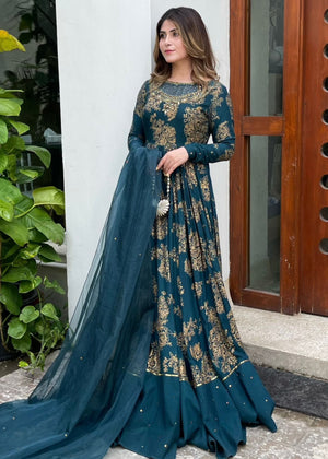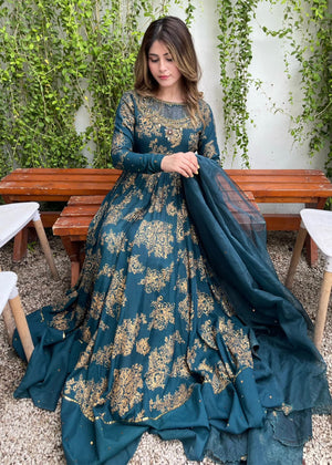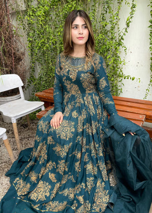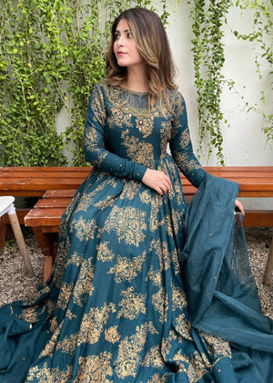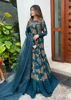 Inspired by Thai Silk, this classic teal-green combination includes a gorgeous organza dupatta with a corner motif design and a sequence spray, as well as pishwas with a charming screen-printed design and a distinctively adorned neckline.