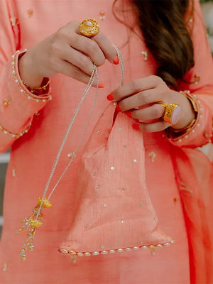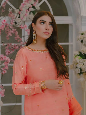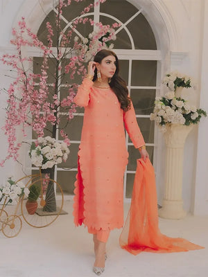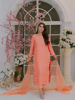 Behold Opulence, the Eid Edit's crown jewel, where lavishness unfurls in every stitch. Embroidered finery twines with side cuts, while the organza dupatta whirls in majesty—elegance redefined for a sparkling Eid statement