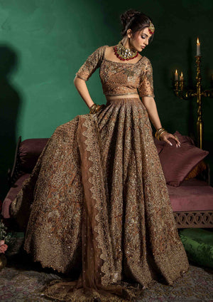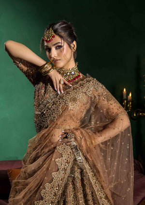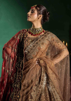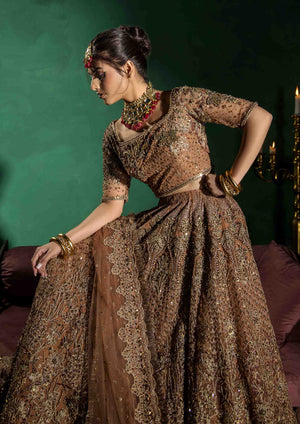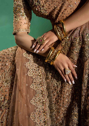 A stunning bridal outfit in a dusty peach hue, composed of net and adorned with intricate embellishments in tilla embroidery patterns. The ensemble includes a wedding drape with exquisite multi-patterned motifs, a heavily adorned shirt with an Indian collar, and a lehenga featuring exquisite floral and bird patterns.