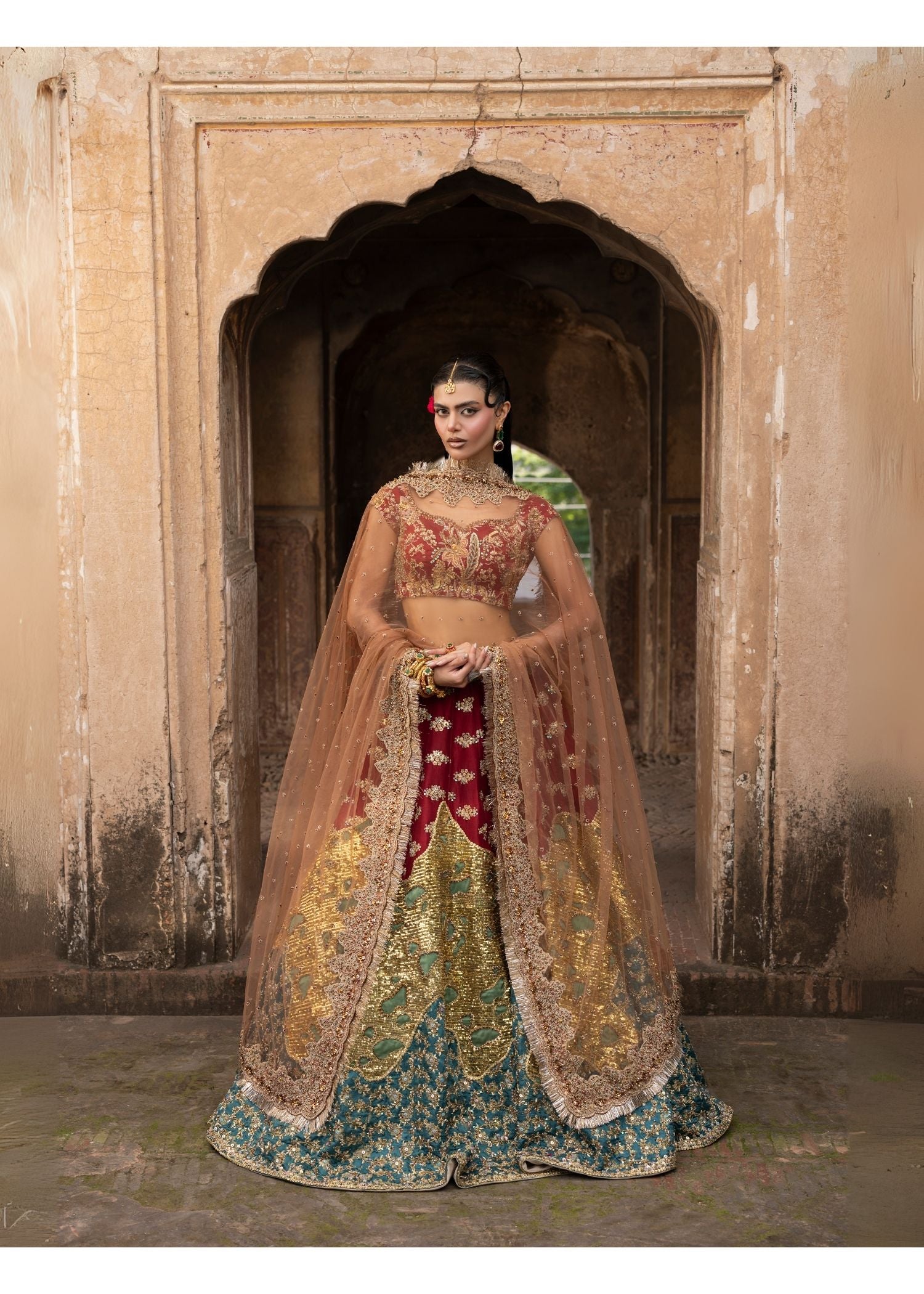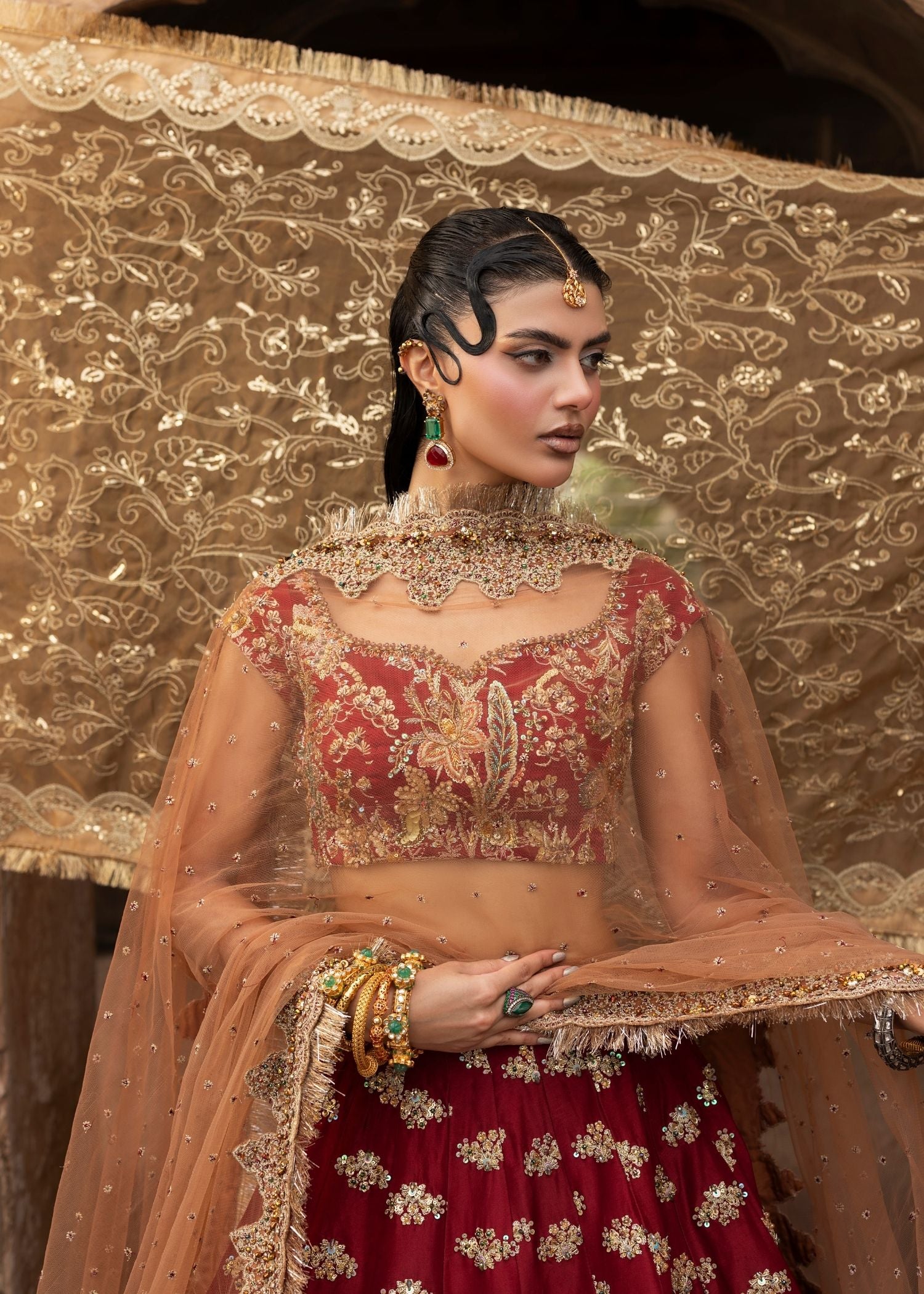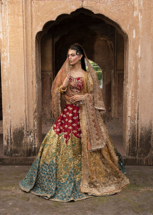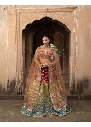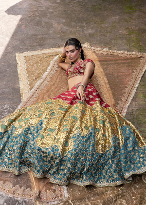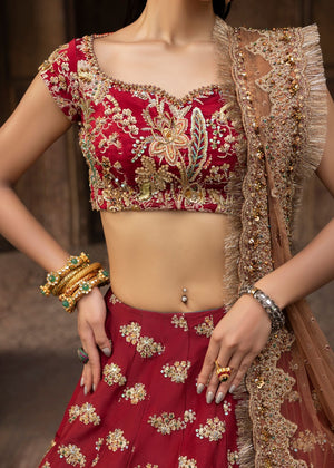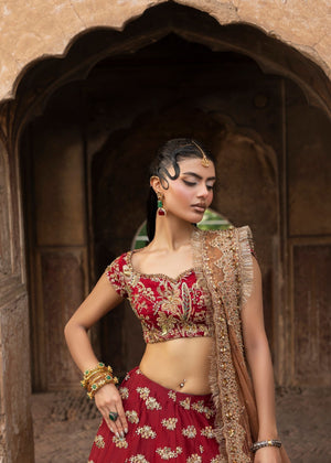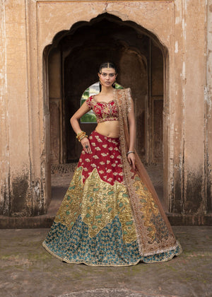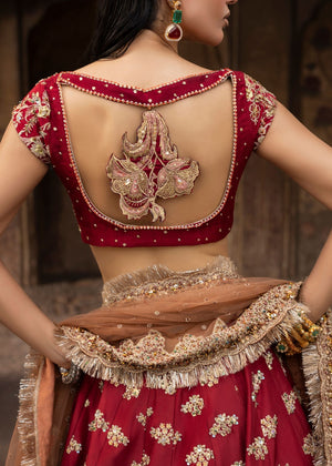 This elegant lehnga set in blood red is totally hand-embroidered with elaborate patterns and features a highly modern backless style. The lehnga is assembled with several materials and three different hues, and it is combined with a net dupatta with all-over border work that completes the ensemble. A sophisticated festive dressy ensemble that combines contemporary craftsmanship with timeless elegance.