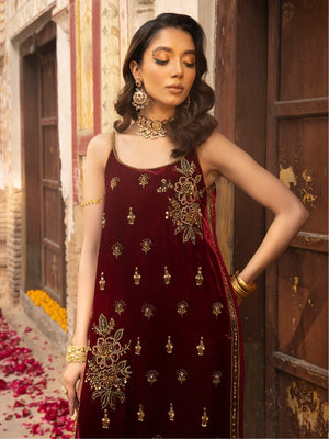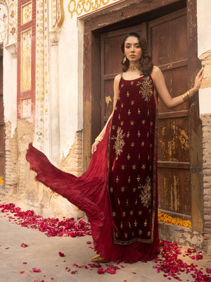Behold an exquisite mehroon long shirt adorned with a splendid ensemble of crystals, cut dana, and sequins, enriched with tilla and naqshi work. Complementing this masterpiece is the beautifull floor length crushed inner, offering a luxurious contrast in texture and style. Draped elegantly over the ensemble is an ethereal organza dupatta, graced with sequins spray allover the dupatta. This ensemble is a true embodiment of timeless elegance and sophistication!