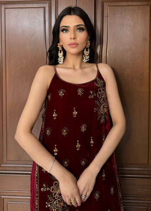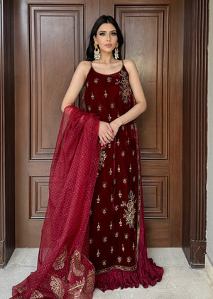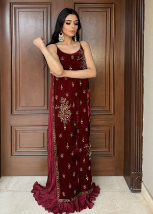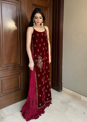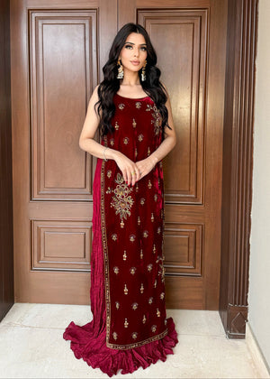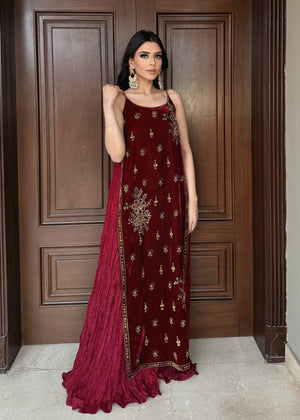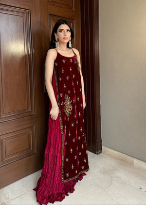 Behold an exquisite mehroon long shirt adorned with a splendid ensemble of crystals, cut dana, and sequins, enriched with tilla and naqshi work. Complementing this masterpiece is the beautifull floor length crushed inner, offering a luxurious contrast in texture and style. Draped elegantly over the ensemble is an ethereal organza dupatta, graced with sequins spray allover the dupatta. This ensemble is a true embodiment of timeless elegance and sophistication!
