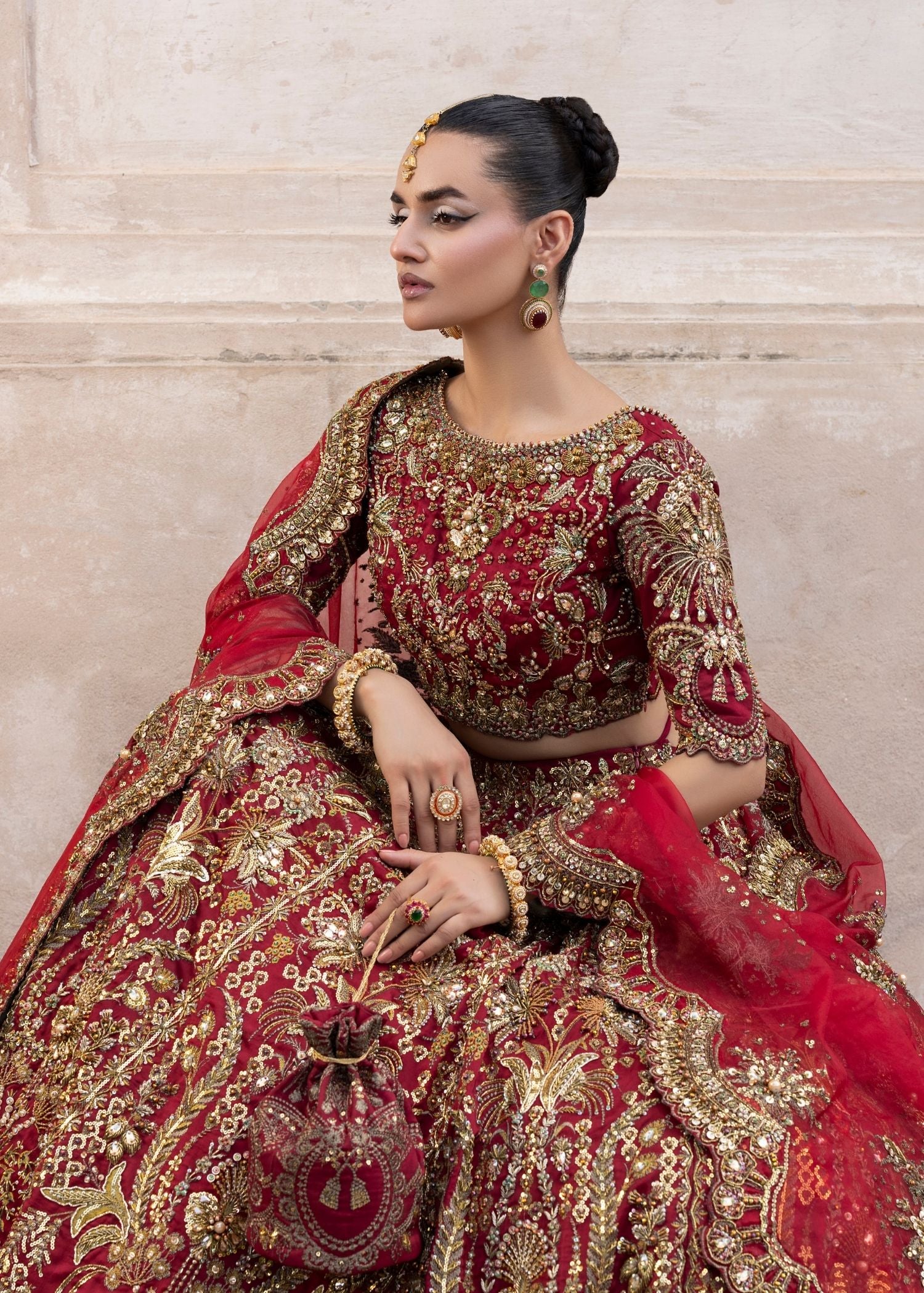 A deep red bridal lehnga choli with a regal-inspired pattern design and numerous elaborate embellishments. This bridal celebration dress is a stunning example of premium craftsmanship with its grand flair and classic grace.