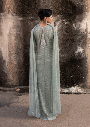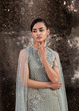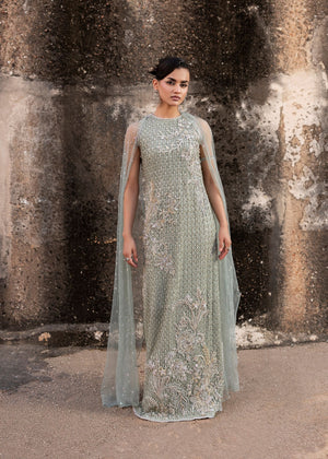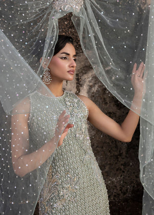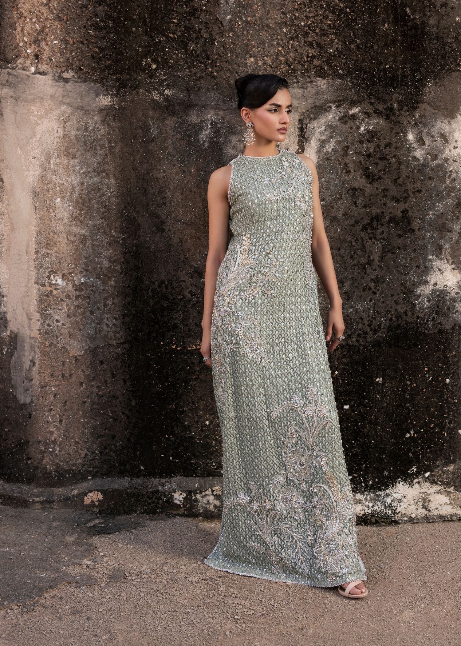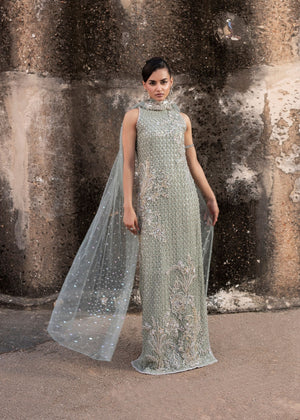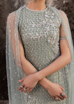 A long a-line shirt in mint green, based on net, embellished with jal embroidery and handcrafted by gorgeous modern pattern work, paired with a net dupatta featuring a midle design, is an incredibly luxurious choice for the ideal modern wedding.