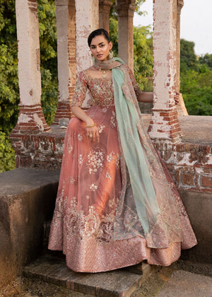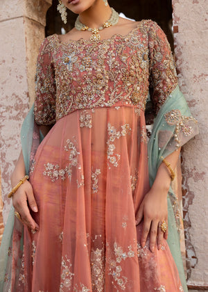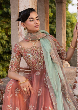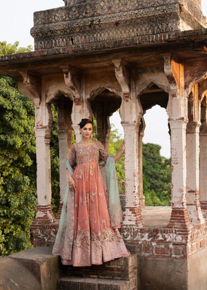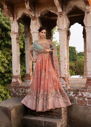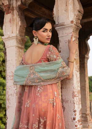 A completely unique work of creation, this exquisite pishwas set in pink and aaqua contrast is intricate with computerised patterns and embellished with further work. The costume is completed with an organza dupatta with all-over border work and a large flaire with heavy boder finishing. The pishwas are made from a variety of materials. combined with inner choridar jamawar pyjamas. A chic festive fancy suit that blends classic elegance with modern craftsmanship.