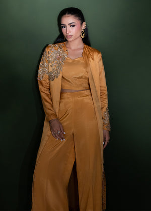 Long open gown based on pure silk mustard color design with embroidered pattern work, beautifully decorated with sequence stones cut Dana dapka naqshi combined with Pure Silk camisole and culottes.