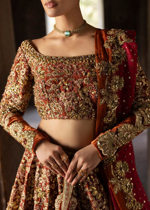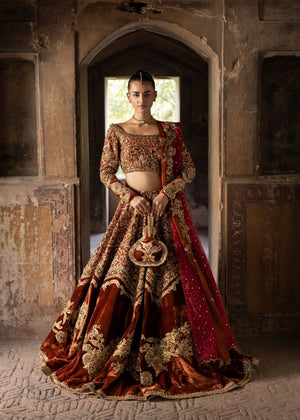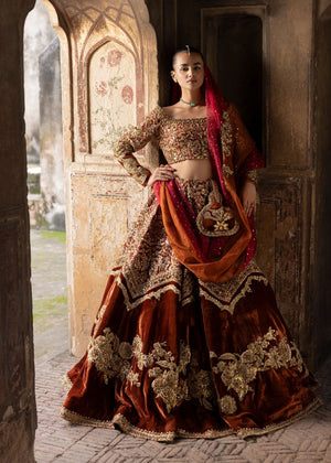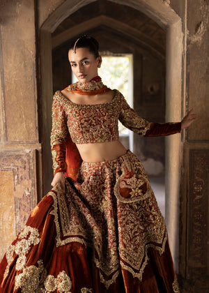A flawless burnt orange velvet lehnga choli with finely detailed embroidery and subtle design embellishments in a very distinctive manner. This festive luxury dress is a statement of subtle glamour and haute craftsmanship, both elegant and timeless.