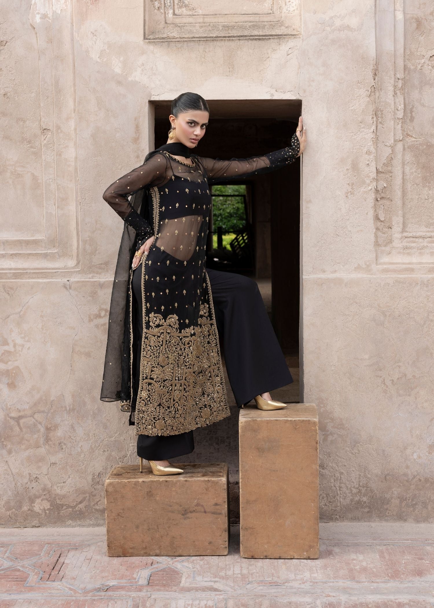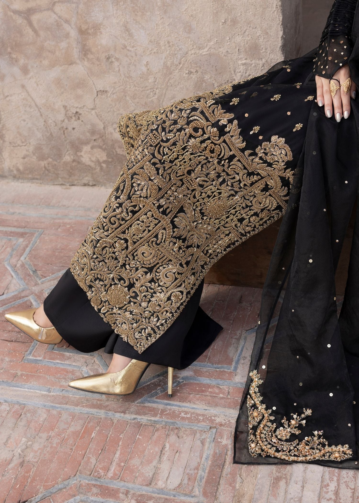 Azar trousers and an organza dupatta complete this rich black organza outfit, which includes a long shirt with a delicate pattern and exquisite hand-embellished antique and match gold work. A festive formal attire that exudes haute elegance and is both spectacular and sophisticated.