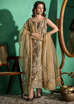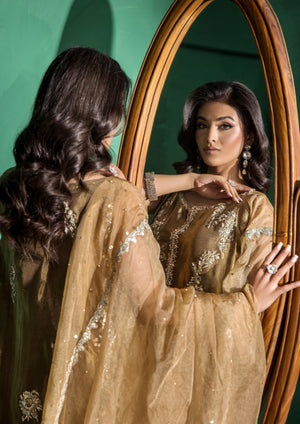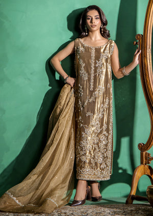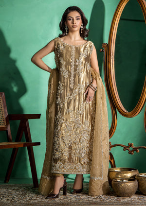 Based on Indian tissue intricates, this stunning antique golden wedding and formal ensemble is sophisticated and features a lot of hand work in a really endearing pattern throughout, including a lovely long shirt. Pair a stunning dupatta that have a elegant look and a border adorned with exquisitely patterned stones ensambled with trouser.