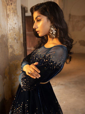 This stunning navi blue velvet maxi oozes luxury as it perfectly combines shimmering crystals, finely detailed cut dana, and dainty sequins. The fabric is exquisitely and precisely embellished with tilla and thread work, adding to its charm! a velvet and orgenza aplic style variant combined.
