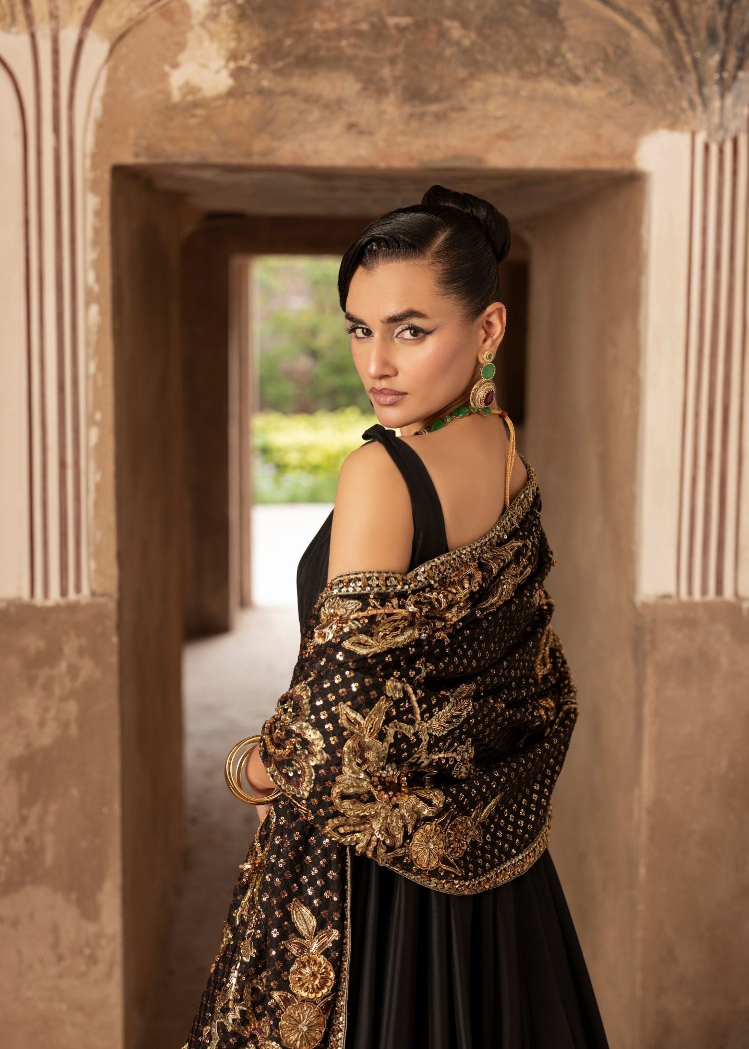 A heavy organza shawl adorned with exquisitely detailed, heavily embezzled flower motifs is worn with a rich black Thai silk pishwas with a velvet border and glittering decorations. a contemporary festive formal dress that epitomises couture elegance and carefree grace.