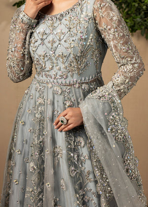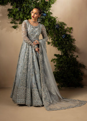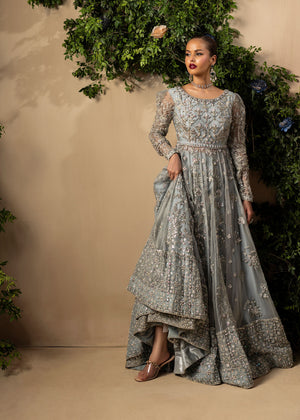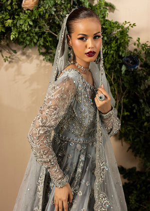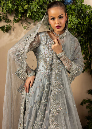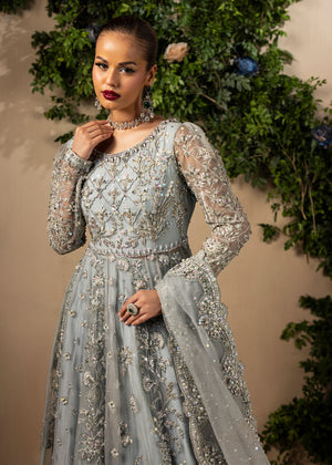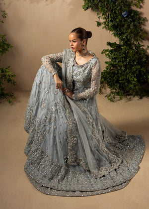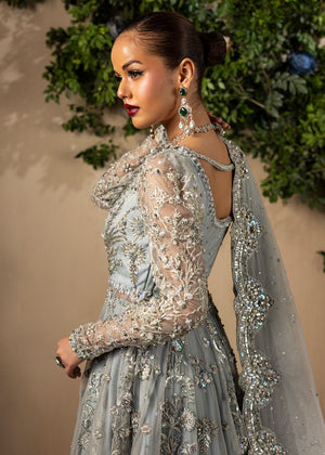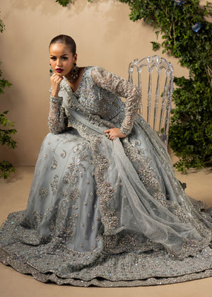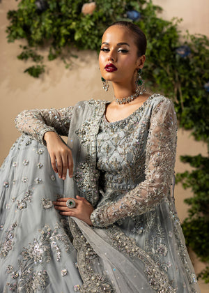 A stunning bridal gown made of organza with elaborate adda work in multi-head patterns, in ice-blue shade. The attire includes a wedding dupatta with four-sided heavily embellished baorders, a blouse with kora dabka work and heavy embellishments, and pishwas with numerous panels of patterning. It is paired with a lehnga with elaborate border work.