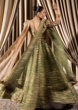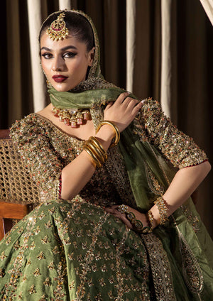 A magnificent bridal lehnga in a vivid olive green tint, fashioned from pure raw silk with elaborate adda work in multi-head patterns. This lehnga is stunning. The ensemble features a lehenga with floral garden of patterning, a blouse adorned with heavy embellishments and gotta work with a back deep indian neck, and a bridal dupatta with beautiful lines and motif work.