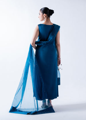 Long shirt based on pure silk in teal blue color with gorgeous embroidery pattern on the neckline and bodywork with different colors of threads in the embroidery to embrace the beauty of the clothing and the pattern is finished with zero elements to make proper finishing of the embellishments. This ensemble is combined with pure silk culottes and an organza dupatta with allover spray and pallu borders of pure silk with randomly spray work.