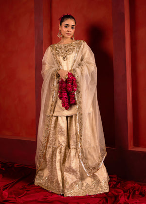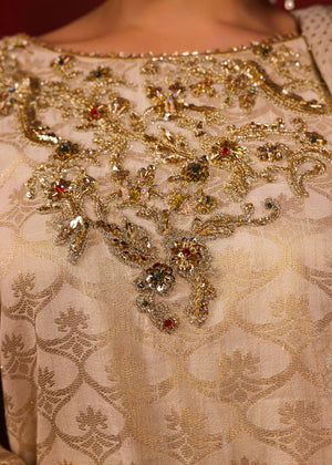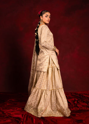 Jacquard attire in off white colour short shirt with a beautiful neckline embellished with heavy ada work and sleeves wrist work paired with ghaghra also on Jacquard with border of sequence work and embroidery and organza dupatta with block prints patterns and hand work touching.