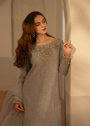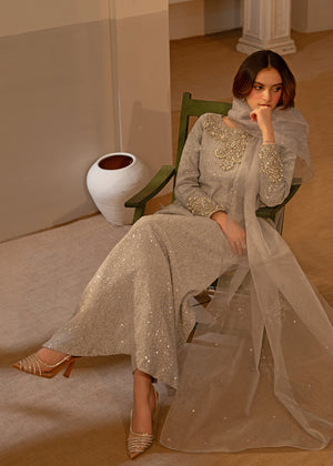 Made of moonlight, this stunning silver pre-owned long shirt has an embellished collar, lovely embalished sleeves, and intricate unaligned sequence designs all over. It is worn with trousers and finished with a dupatta with block prints.